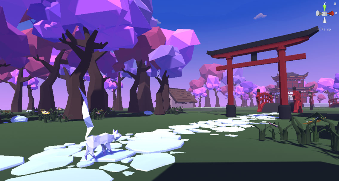 Screenshot of the low poly project Okami Kitsune's minimalistic main HUD. Project was created inside of Unity using models created inside of Maya.